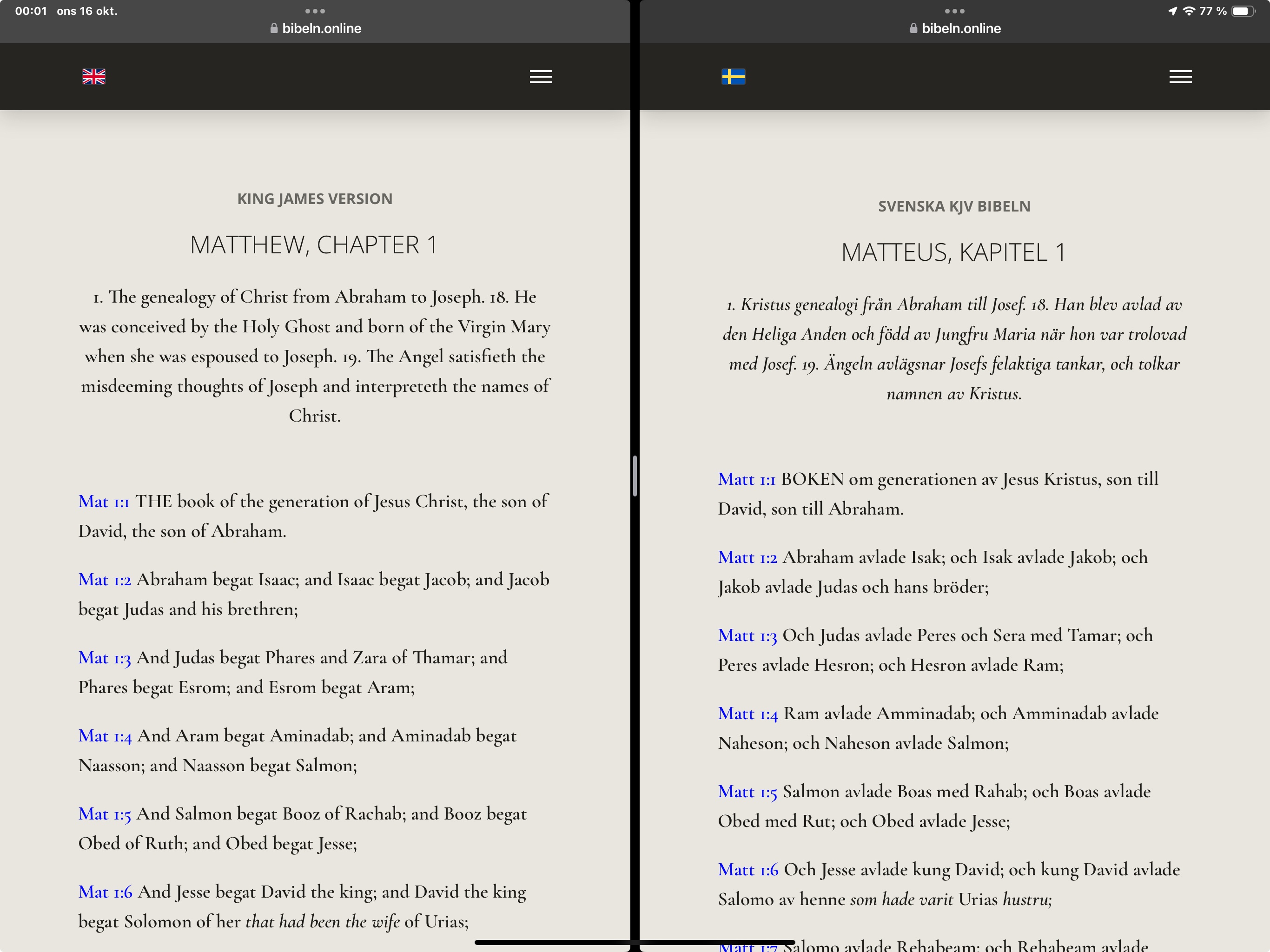 Vi ser fram emot att hjälpa dig på din digitala resa att utforska Guds ord, tillgängligt för dig när du vill, via webbläsaren som t.ex. Chrome, Safari eller Mozilla Firefox. Läs den Heliga Bibeln online och upplev sanningsenliga översättningar från den korrekta linjen av manuskript.